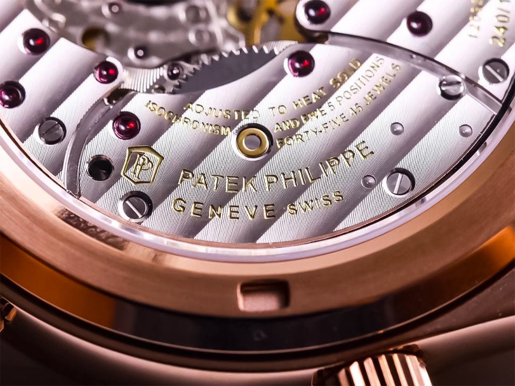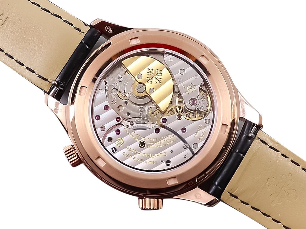 Rose gold plated, screw down crowns. Case diameter: 43mm. Height: 10.1mm. |