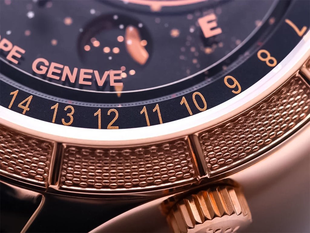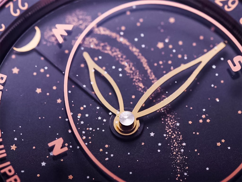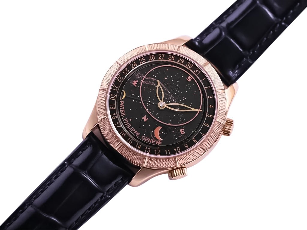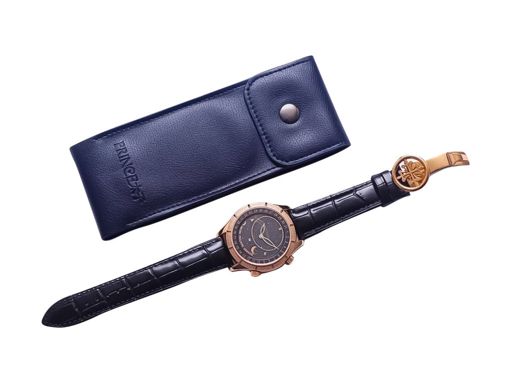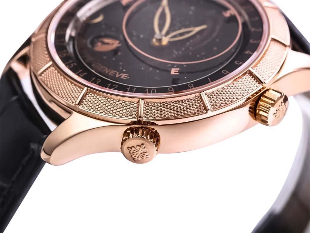 A masterpiece of elegance and precision, this rose gold-plated watch captivates with its celestial charm. The 43mm case is perfectly proportioned for a sophisticated look, while the 10.1mm height adds ergonomic comfort. Its black dial features an enchanting moonphase and sky chart display, presenting a truly cosmic aesthetic that effortlessly stands out.