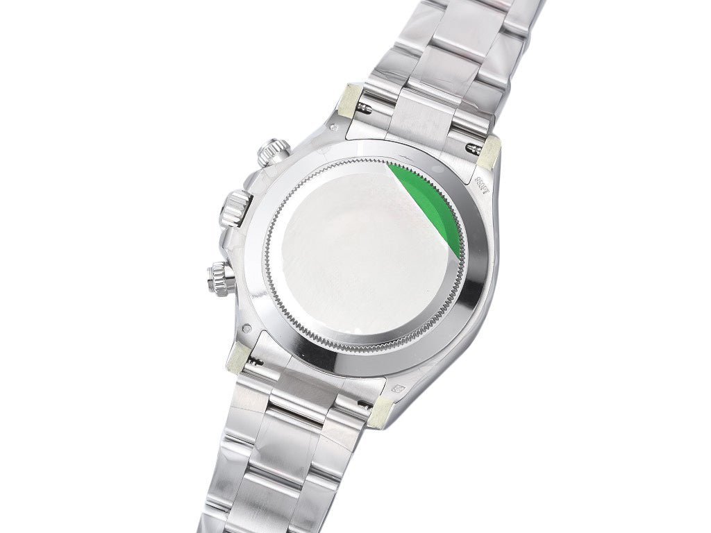 Stainless steel case with screw down crown and chronograph pushers. Case diameter: 40mm. Height: 12.4mm. (904L Stainless Steel) |