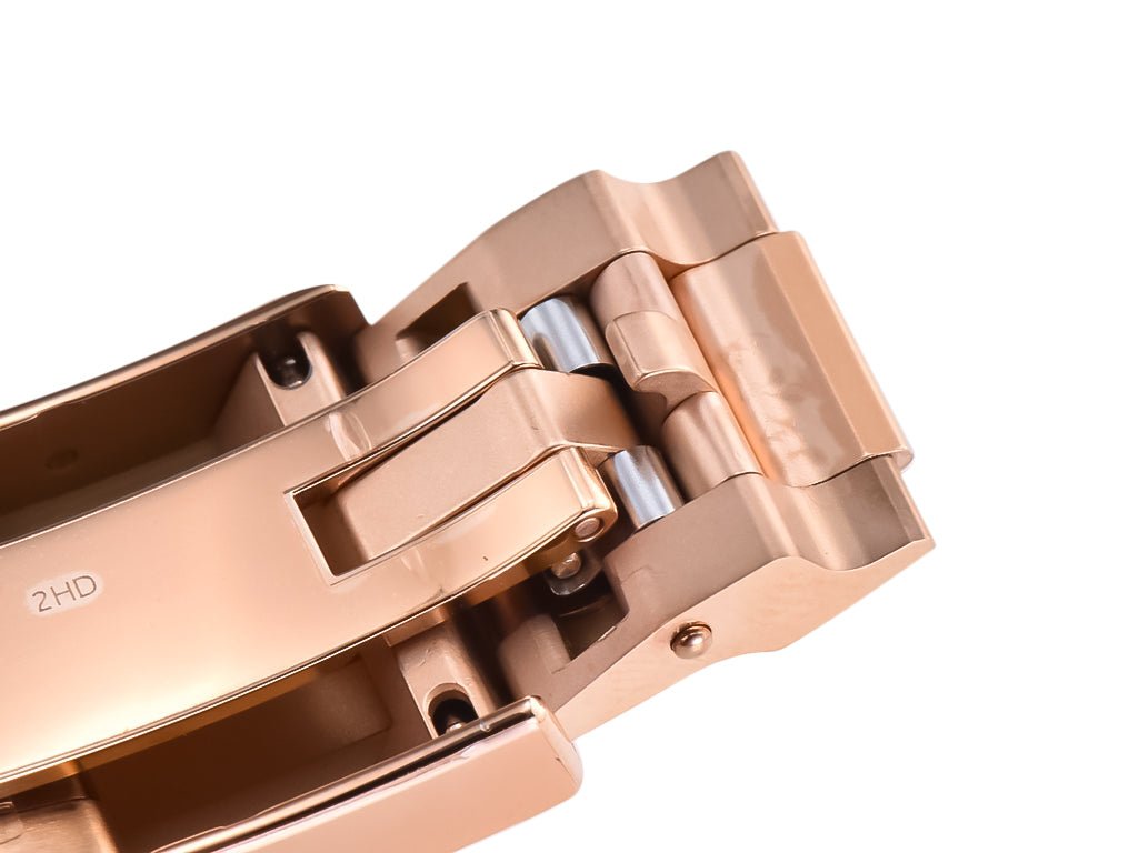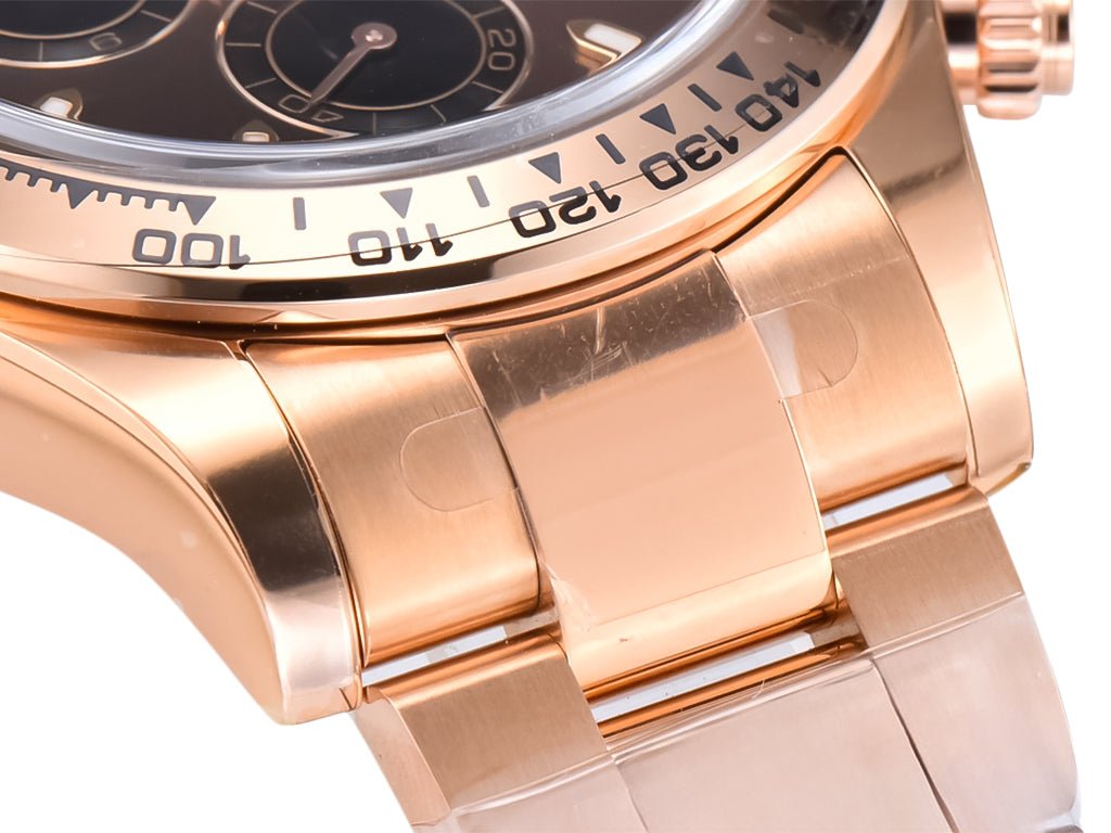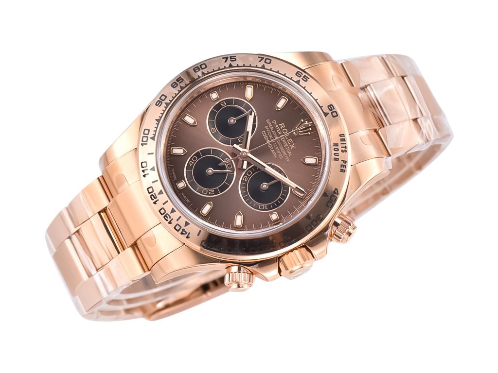 A statement of timeless elegance, the Cosmograph Daytona Rose Gold with Chocolate Dial blends exceptional craftsmanship with refined luxury. Designed for those who embrace distinction, it features a rose gold-plated case adorned with a screw-down crown and chronograph pushers that exude confidence and durability. The striking chocolate dial is enriched by rose-gold outlined black subdials, ensuring readability while amplifying its sophisticated charm.