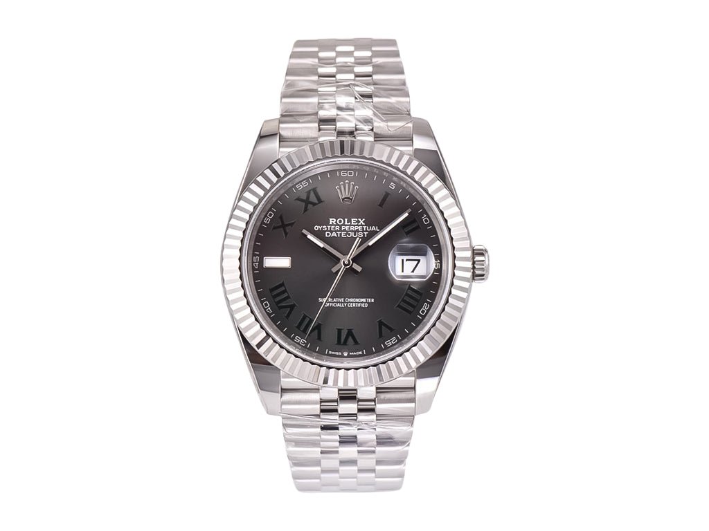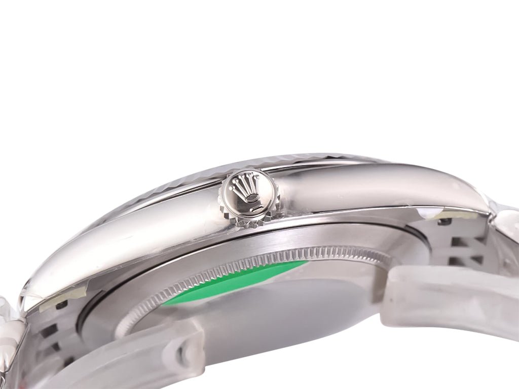 An iconic blend of sophistication and modernity, the Datejust 41 Stainless Steel ‘Wimbledon’ on Jubilee delivers timeless appeal with a robust design. Housed in a stainless steel case with a screw-down crown and fluted bezel, this timepiece offers durability without compromising elegance. The striking grey dial, adorned with green Roman numerals and a date window at three o’clock, epitomizes refinement while being easy to read.