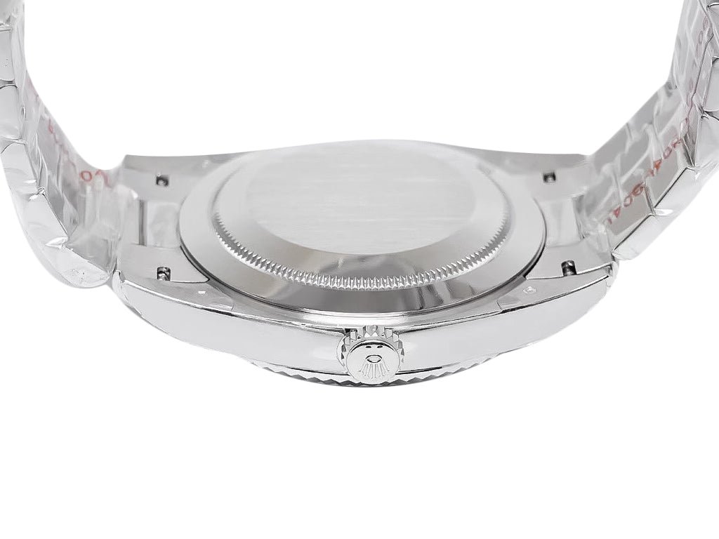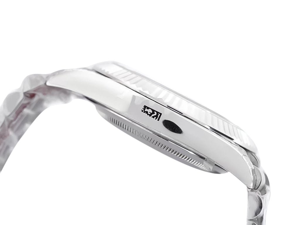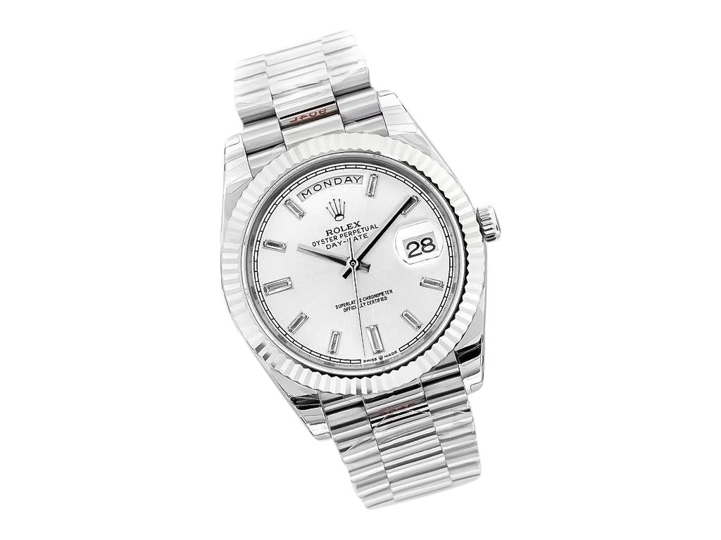 The Day-Date 40 White Gold ‘President’ is a symbol of effortless sophistication and precision. This timepiece, which has a white gold-plated case and a unique fluted bezel, is a classic example of elegance. Its silver dial features dazzling diamond simulant indices that highlight the day and date window functionality—seamlessly combining beauty with practicality.
