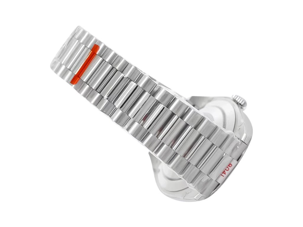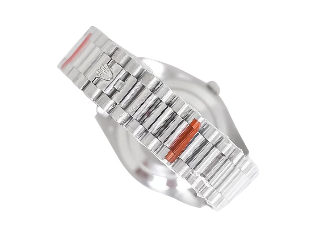 Equipped with the reliable self-winding ETA 2836 automatic movement, it delivers sweeping seconds and up to 38 hours of power reserve for enduring performance. The tungsten-weighted white gold-plated President bracelet ensures a refined aesthetic while providing durability and comfort for everyday wear.