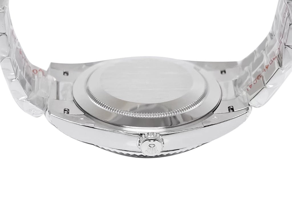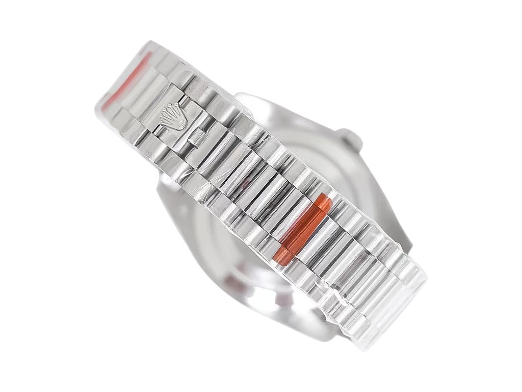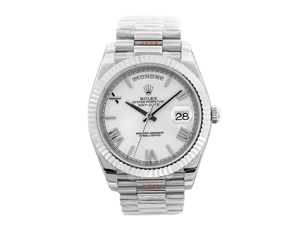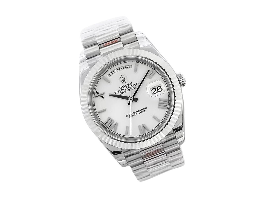 A timeless masterpiece, this Day-Date 40 features a white gold-plated case with a fluted bezel for refined elegance. Its white dial showcases Roman numeral indices and day-date windows, complemented by the President bracelet’s impeccable design. Powered by an automatic movement offering a sweeping second hand and 38-hour reserve, it blends luxury and precision seamlessly.