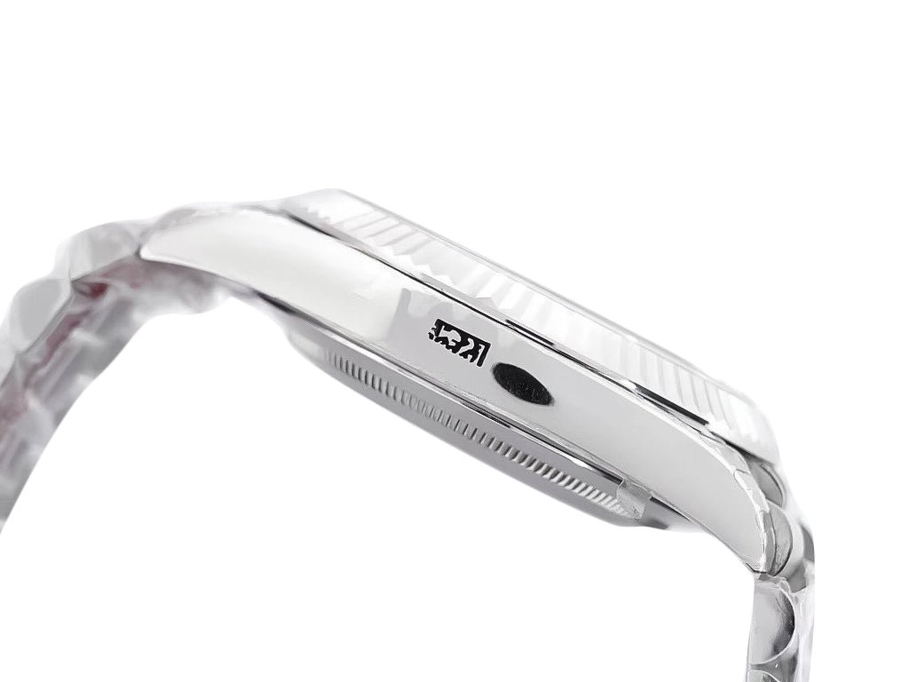 Crafted to embody timeless sophistication, this 40mm watch features a striking white gold-plated case adorned with a fluted bezel for an elegant touch. The flawless white dial, enhanced by bold Roman numeral indices and day-date display windows, reflects precision craftsmanship at its finest. A self-winding ETA 2836 automatic movement powers the timepiece, providing seamless functionality with sweeping seconds and reliable performance boasting a 38-hour power reserve.