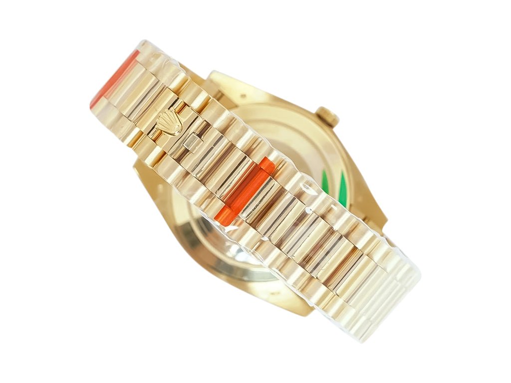 Its fluted bezel showcases classic refinement, perfectly complemented by the President bracelet—a yellow gold-plated marvel designed for enduring comfort. Powered by a self-winding ETA 2836 automatic movement, it offers smooth sweeping seconds along with reliable day and date functionality plus an impressive 38-hour power reserve.