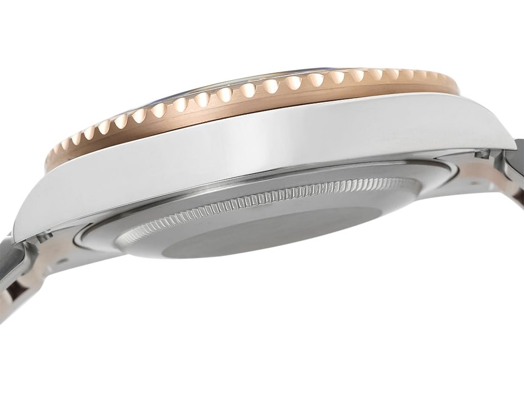 Two tone rose gold plated and stainless steel case with screw-down crown and ceramic bezel. Case diameter: 40mm. Height: 12mm. (904L Stainless Steel).