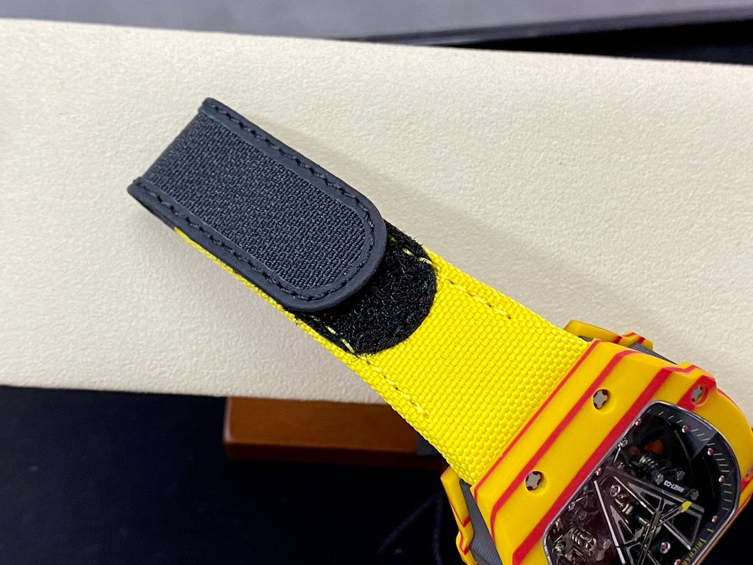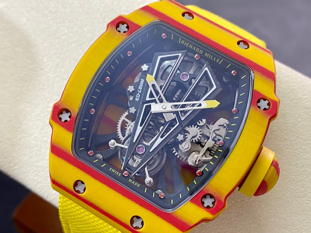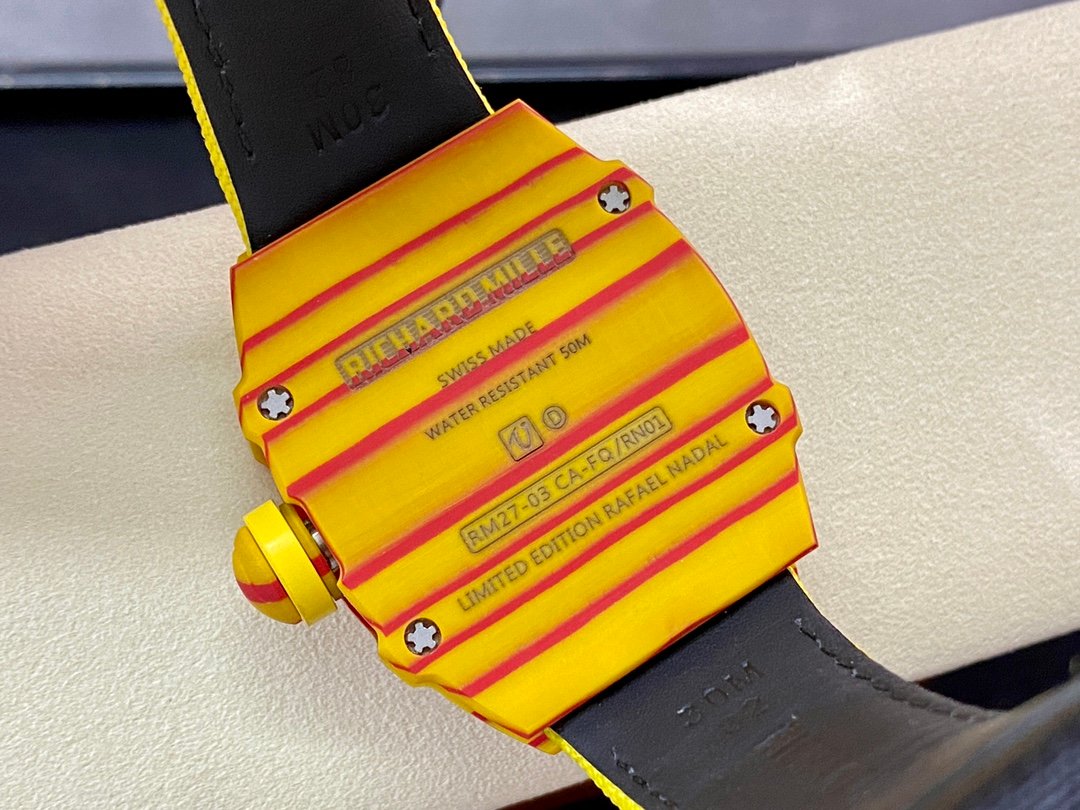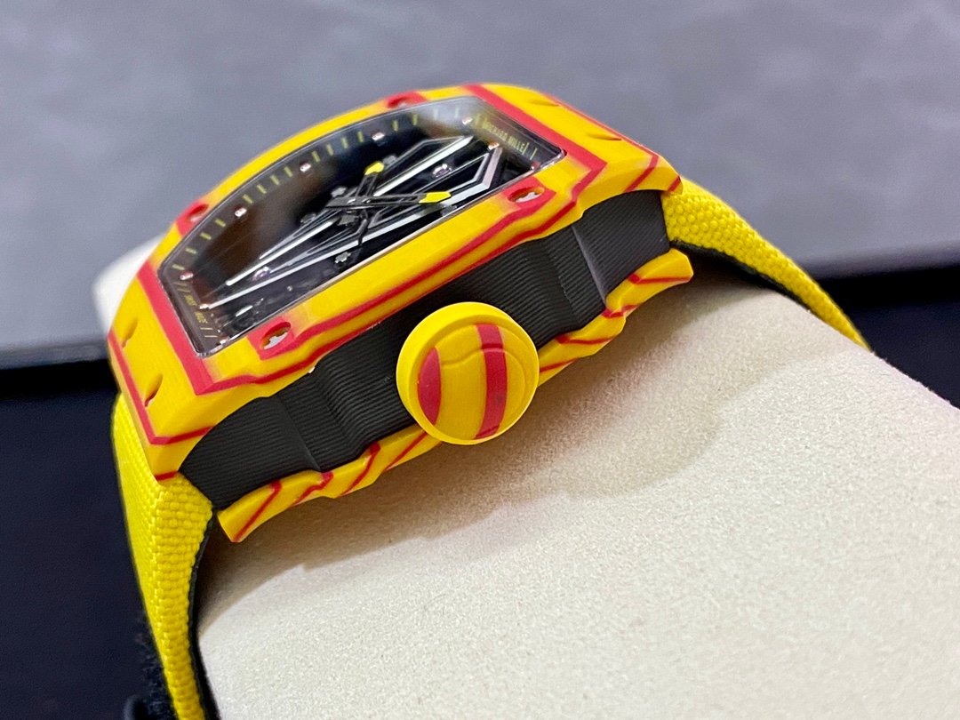 In order to achieve extreme shock resistance, Richard Mille combines the most cutting-edge technology of materials industry and precision processing technology – using t quartz material to make one-piece case and bottom plate, the bridge is made of grade 5 titanium, and the tourbillon structure is made with astonishing precision. error. The design of the orange case and strap is inspired by the Spanish flag. The crown is specially made into the shape of a tennis ball. On the black and gray carbon T base plate, you can see stacked carbon fiber cutting patterns. The design of the movement’s hollow bridge is inspired by Image of bull.