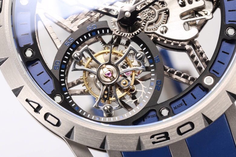 The BBR Roger Dubuis King Series Titanium Tourbillon Model: RDDBEX0479 is a high-end Superclone watch that is made to resemble the original Roger Dubuis King Series Tourbillon watch. It has a titanium case that is 45mm in diameter and 13.5mm in thickness. The watch is powered by a seagull custom RD505SQ winding movement, which is accurately adjusted in six directions and has a power reserve of up to 50 hours. The dial is hollowed out and features a luminous scale, black DLC coating, and a second dial in layered titanium. The hands are covered with a luminous coating for easy and clear reading. The watch is also equipped with a sapphire crystal glass with anti-glare coating and a natural rubber strap imported from Germany.