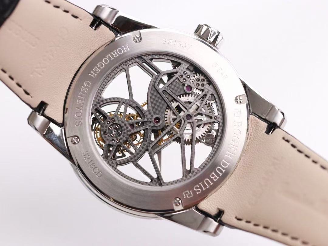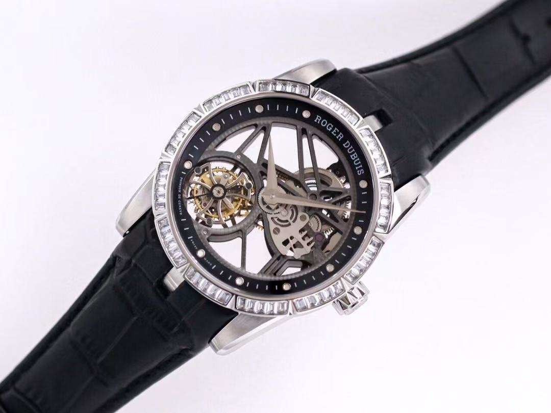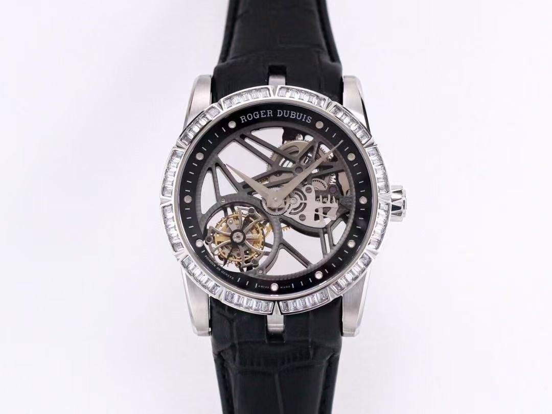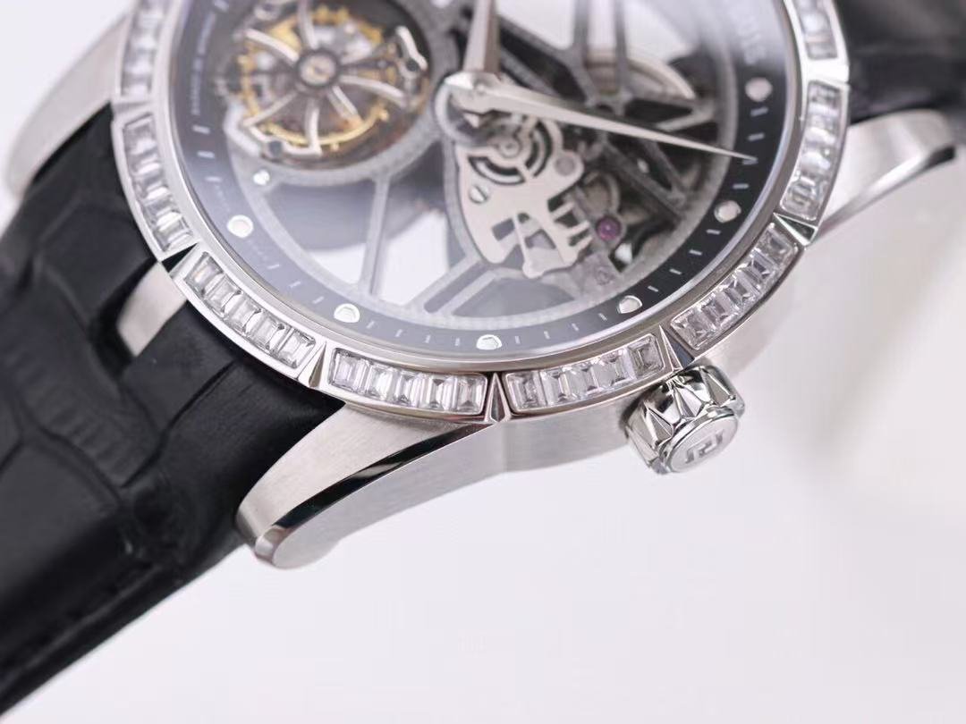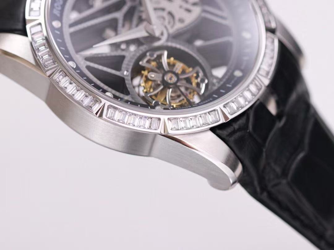 The BBR Roger Dubuis King Series Titanium Tourbillon Model: RDDBEX0479 is a high-end Superclone watch that is made to resemble the original Roger Dubuis King Series Tourbillon watch. It has a titanium case that is 45mm in diameter and 13.5mm in thickness. The watch is powered by a seagull custom RD505SQ winding movement, which is accurately adjusted in six directions and has a power reserve of up to 50 hours. The dial is hollowed out and features a luminous scale, black DLC coating, and a second dial in layered titanium. The hands are covered with a luminous coating for easy and clear reading. The watch is also equipped with a sapphire crystal glass with anti-glare coating and a natural rubber strap imported from Germany.
