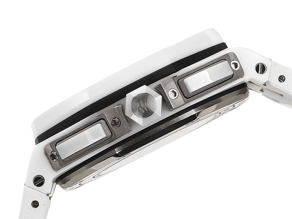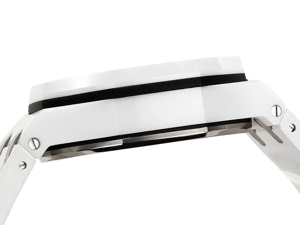 Bold design meets professional craftsmanship in this 44mm chronograph, featuring a ceramic-wrapped stainless steel case and a striking white Mega Tapisserie-patterned dial. The blue chronograph accents offer precision timing while elevating the watch’s overall aesthetic. Completed with a smooth white rubber strap and tang buckle, this timepiece seamlessly blends style and durability.