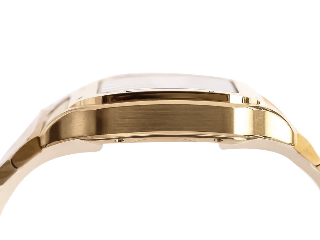Show off your sense of style and sophistication with this exquisitely made large yellow gold watch. Featuring a detailed white dial adorned with Roman numeral indices and a discreet date window, it offers classic charm paired with modern precision. The brushed yellow gold-plated bracelet ensures comfort while the butterfly clasp and smart link adjustable system provide flexibility for an impeccable fit. Enjoy effortless versatility thanks to the quick switch mechanism for easy strap adjustments.