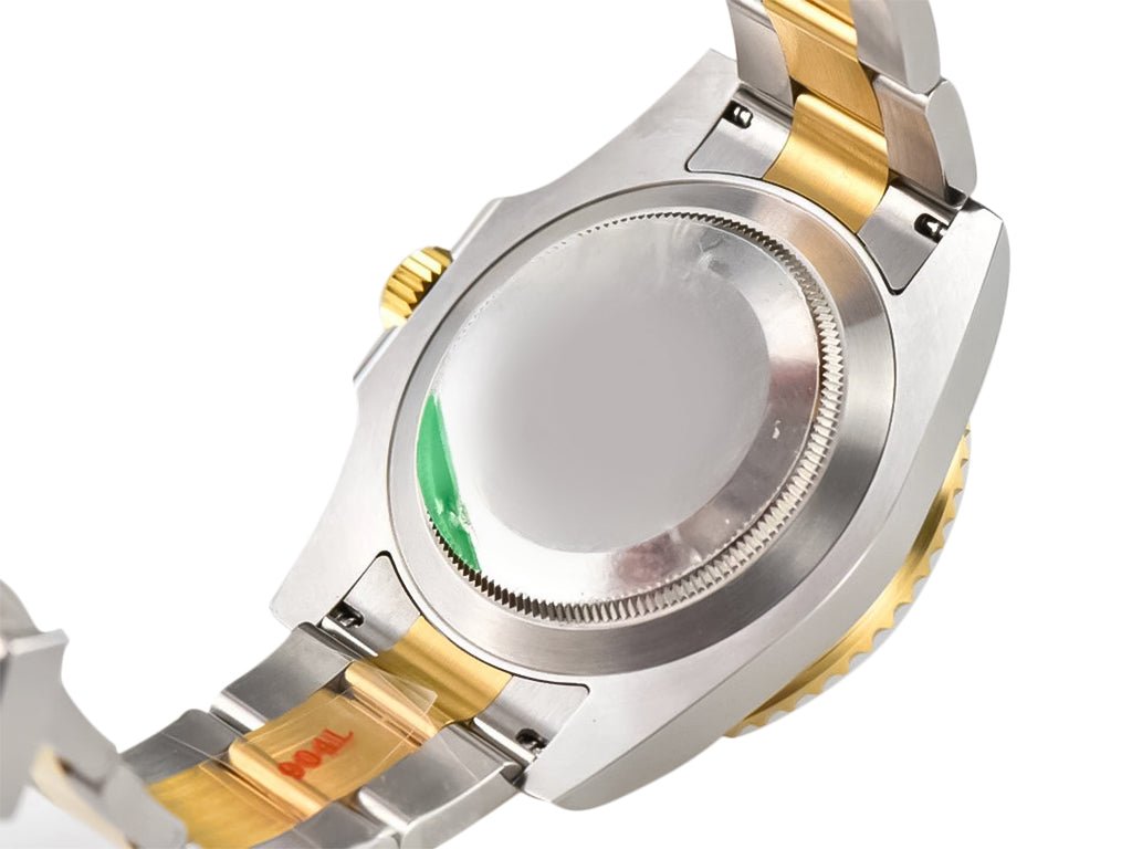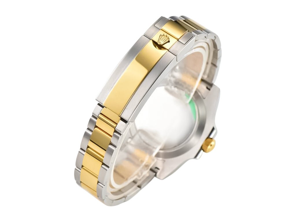 Two tone yellow gold plated and stainless steel case with screw down crown and ceramic bezel. Case diameter: 40mm. Height: 12.4mm. (904L Stainless Steel)